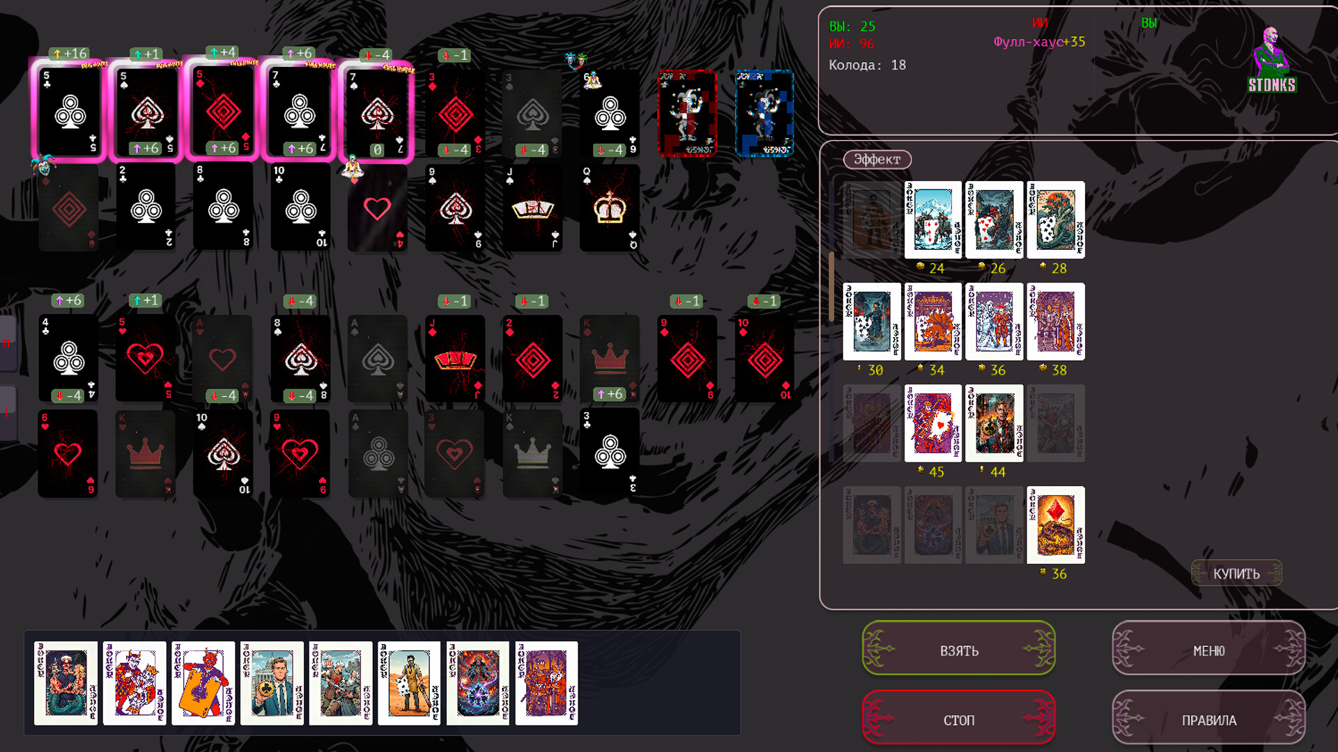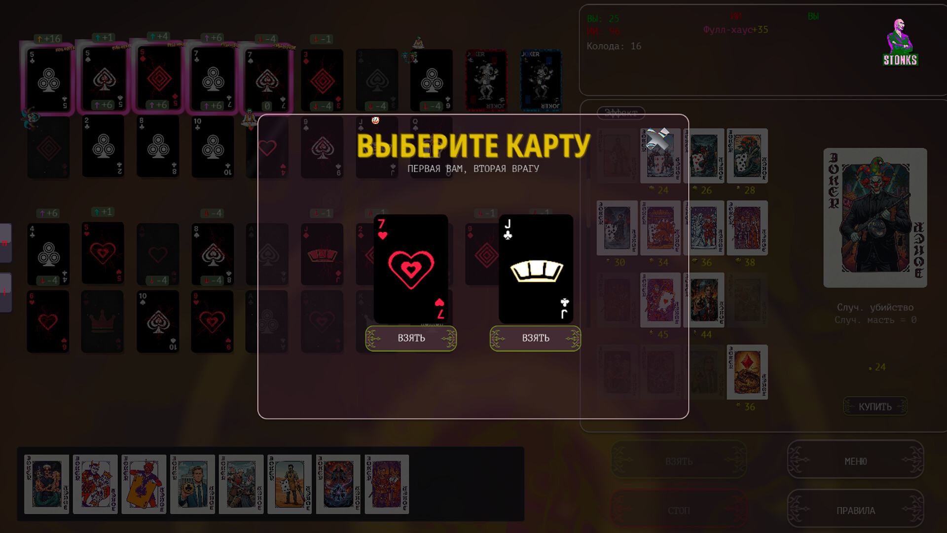 Тяни карты, собирай стриты и флеши, копи пары и каре. Но будь готов — джокер противника может обнулить твои тузы, удвоить твои двойки или просто убить половину колоды.