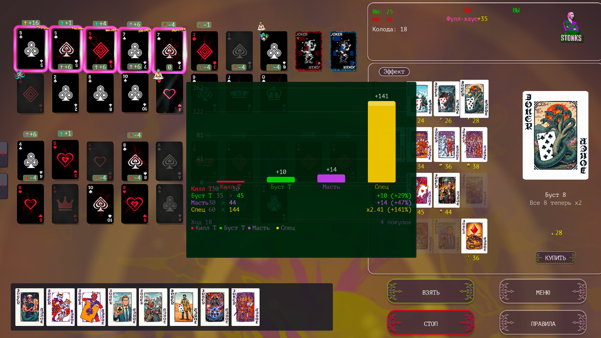 Между раундами — магазин, где за заработанные очки можно купить новых джокеров. Но цены растут с каждой покупкой! Чем больше берёшь — тем дороже следующий. Бездумный шопинг приведёт к тому, что к концу матча ты не сможешь позволить себе ничего. Планируй покупки с умом.