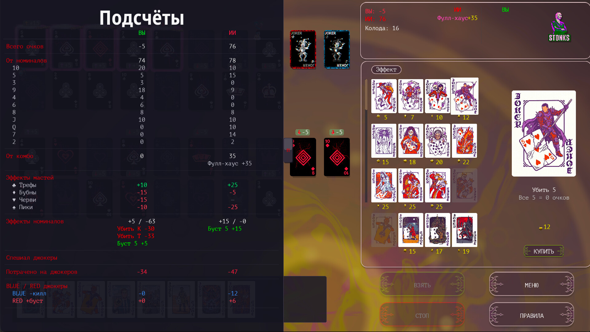 Здесь нет скрытых карт и случайного блефа. Ты видишь всё: свои карты, карты врага, активных джокеров. Каждое решение — осознанное. Проиграл? Виноват ты, не рандом.