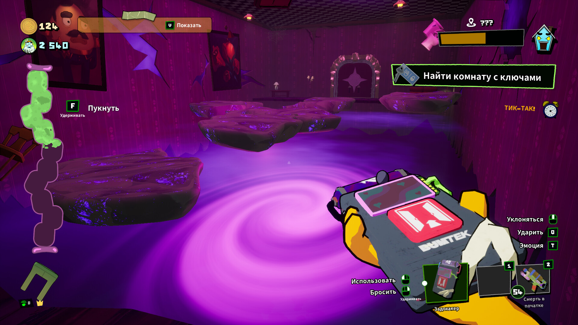 Зажигайте фонари, орудуйте нелепым оружием и швыряйте причудливую мебель, чтобы выбивать двери, решать загадки с привидениями и держать призраков на расстоянии (или просто закидывать друзей всякой ерундой).