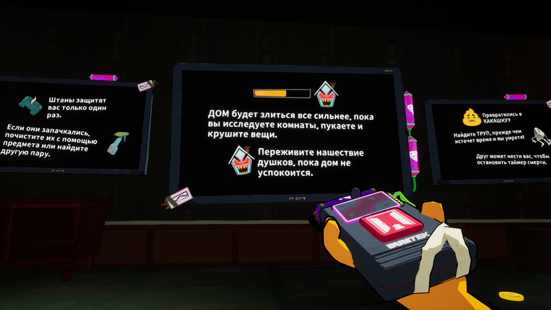 Вы с друзьями застряли в особняке с привидениями и отчаянно ищете туалет. Ваша цель — пройти по заброшенным коридорам и пережить встречи с призраками, чтобы добраться до «фарфоровой земли обетованной» и сбежать, пока кишечник вас не подвел!