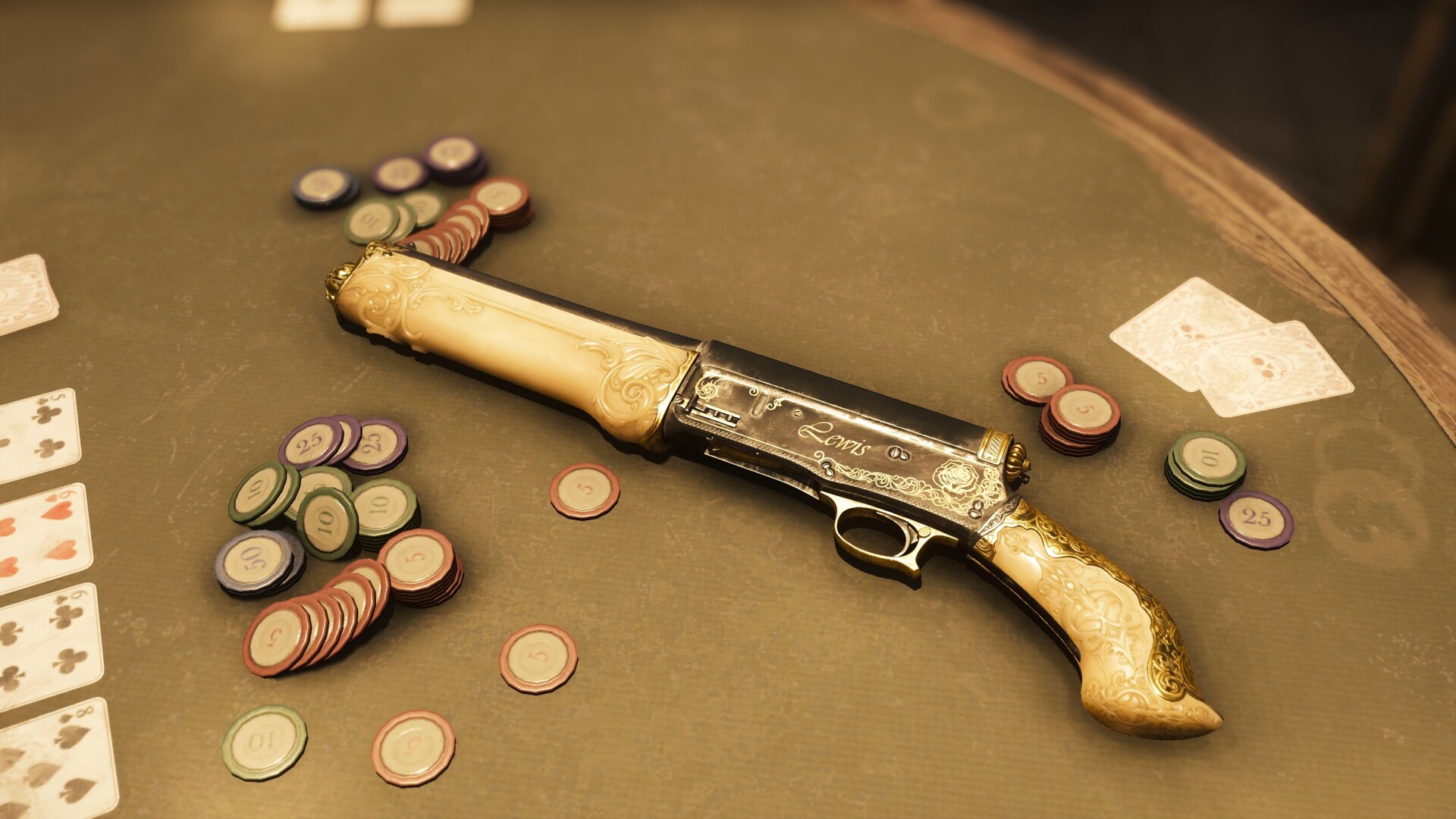 Когда собирались гости, Леди Льюис любила порадовать их салонными трюками. Например, выстрелом выбить сигару изо рта подпившего добровольца. На Охоте стрелять приходится в других, но этот армейский «Стриж» служит ей напоминанием о лучших днях.