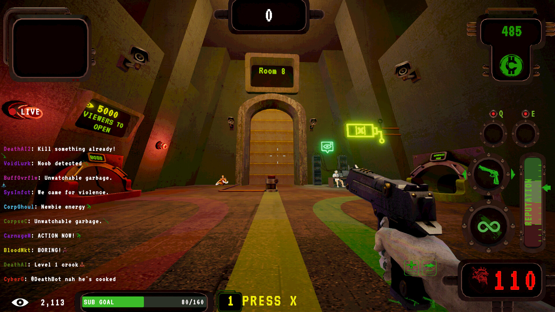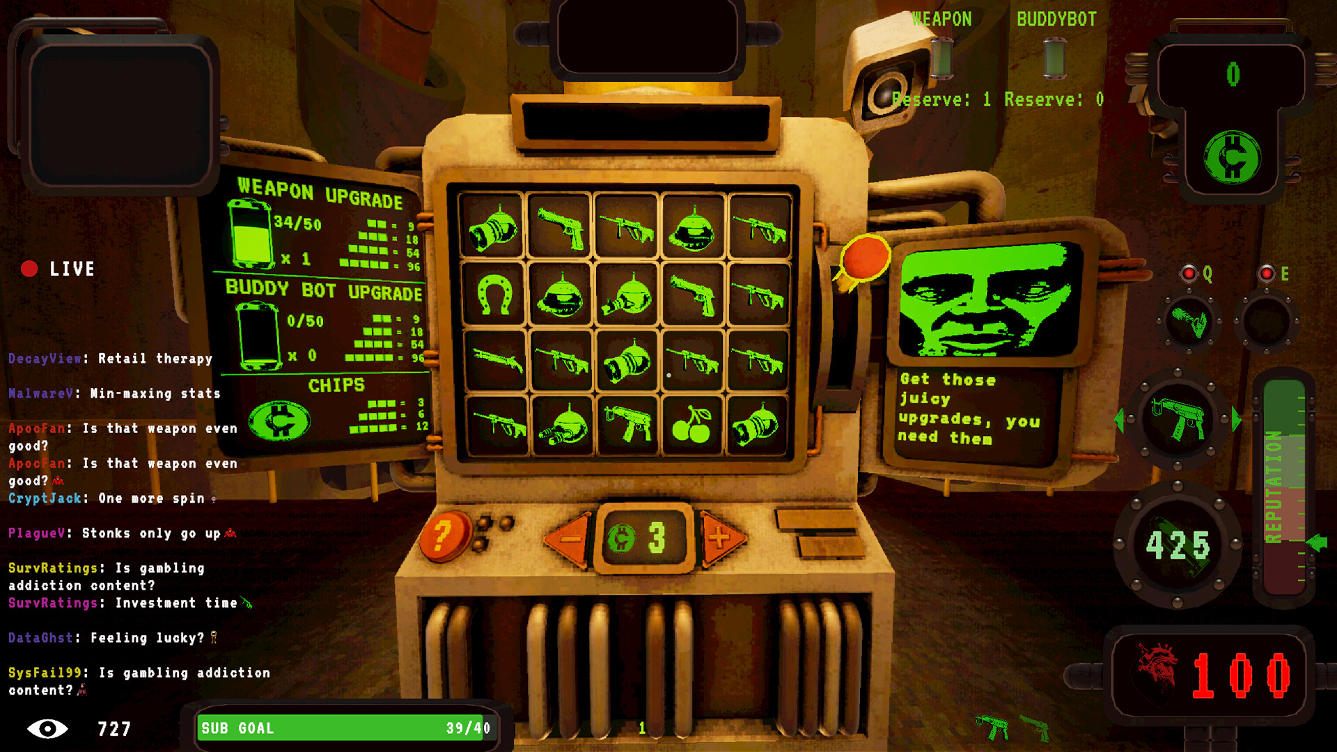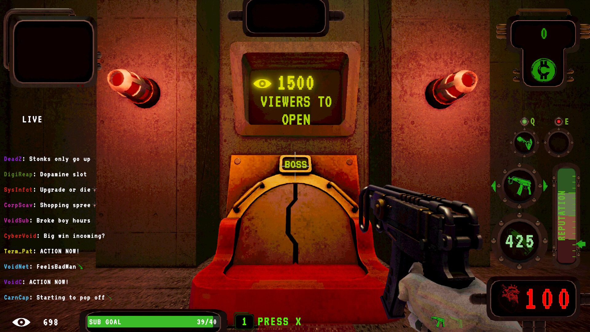 Борись за выживание в кровавом шоу, транслируемом в прямом эфире. Играй на ставках, чтобы получить оружие и способности, в этом динамичном roguelike-шутере. Зарабатывай донаты от садистской аудитории и уничтожай волны мутантов, чтобы удовлетворить инвесторов. Твоя жизнь — это представление. Твоя смерть — это контент.