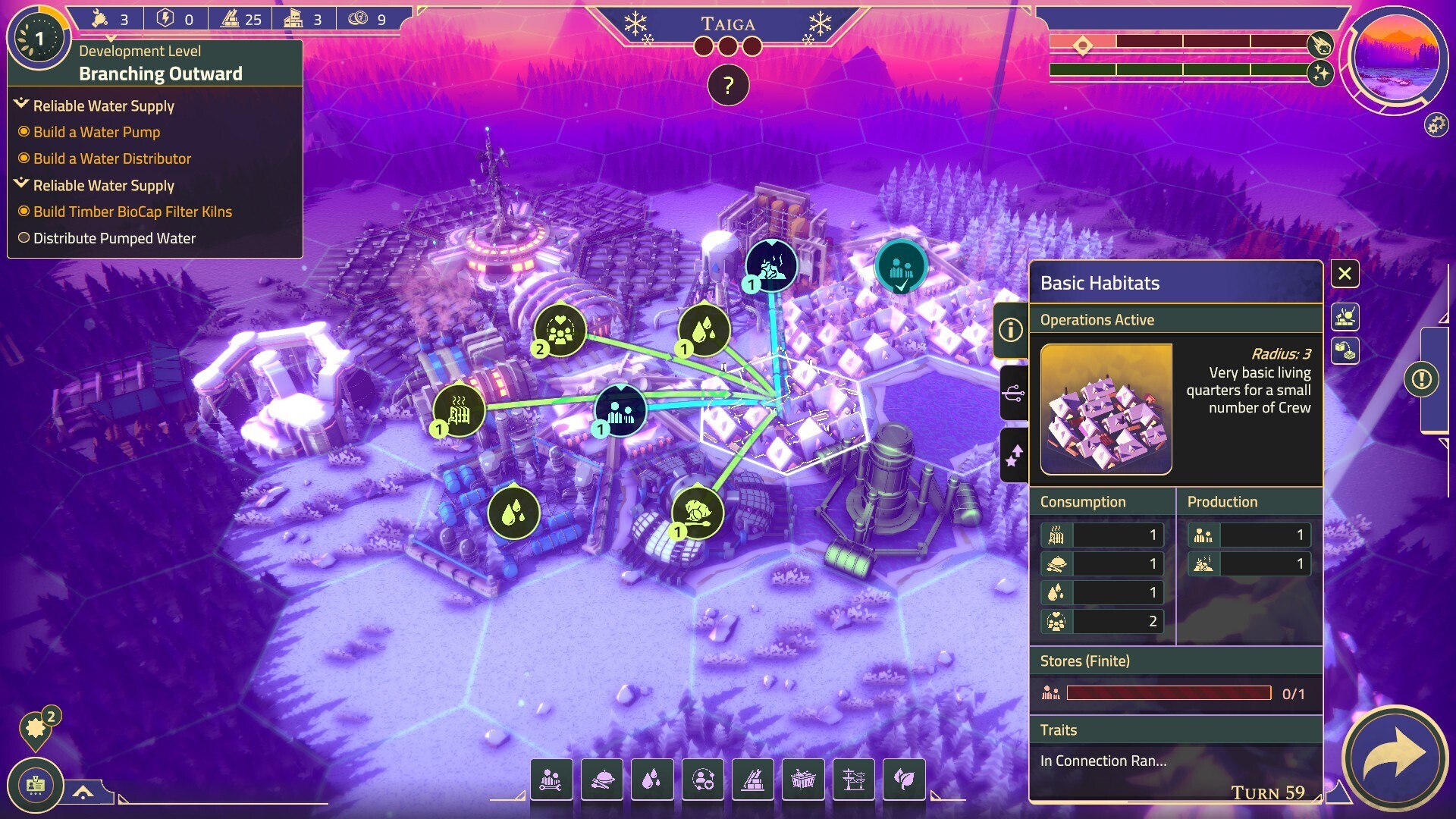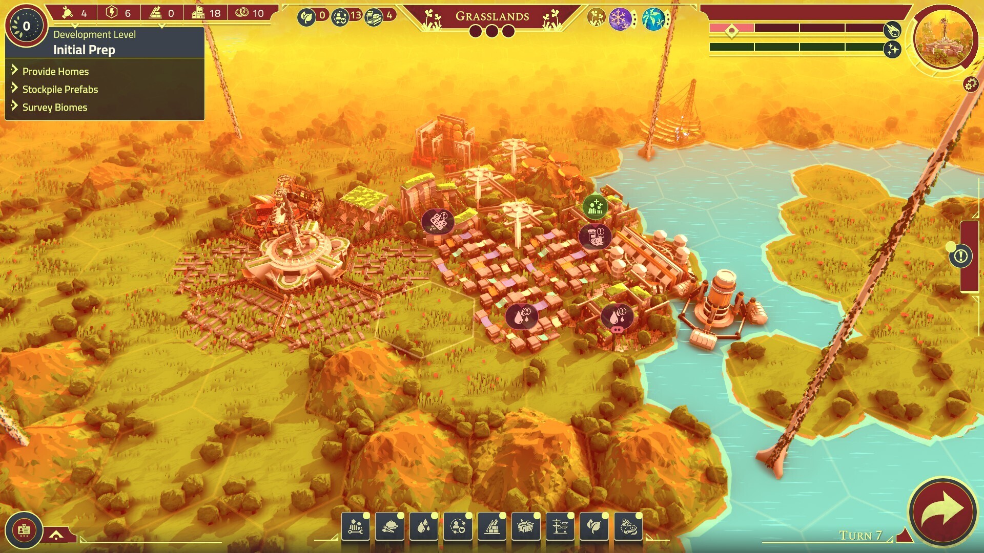 Разработайте планировку своего города, чтобы максимизировать преимущества, обеспечивая синергию для благополучия населения и восстановления поврежденных экосистем корабля.