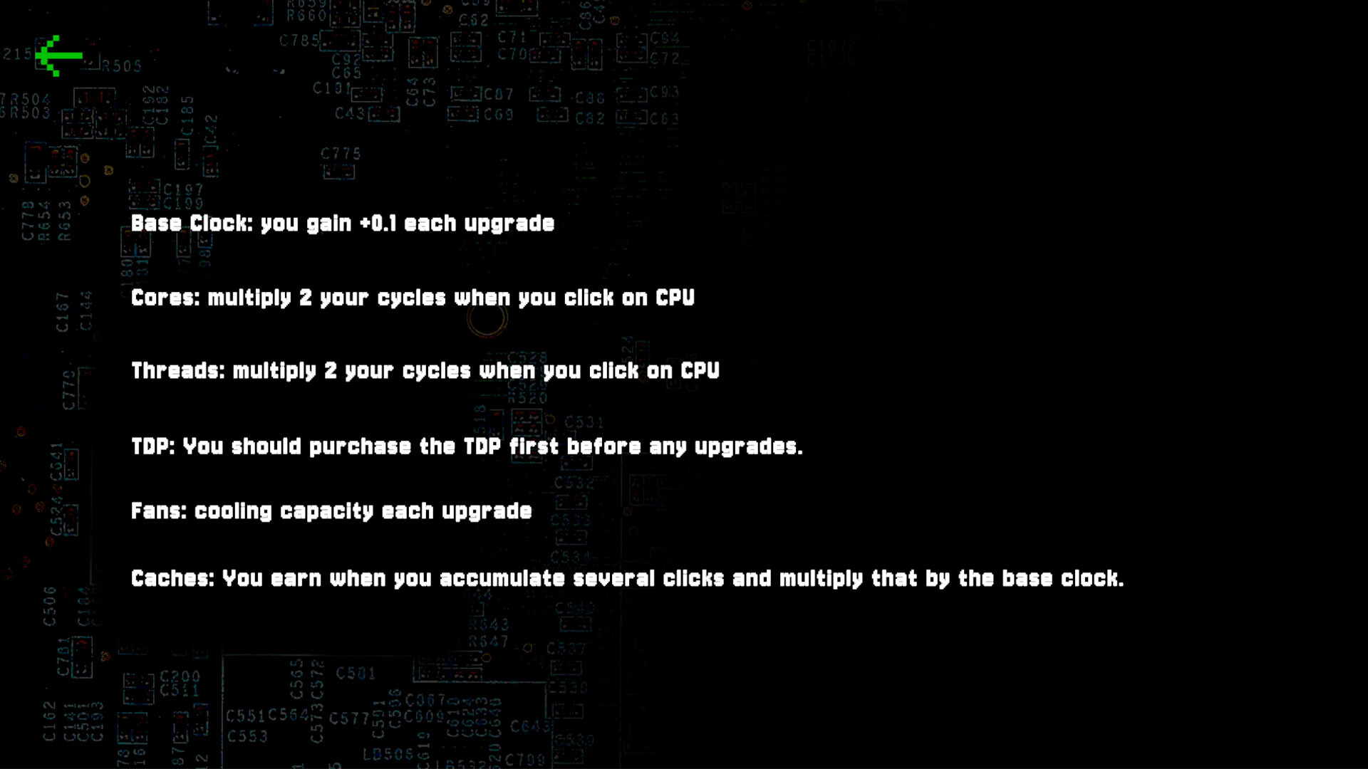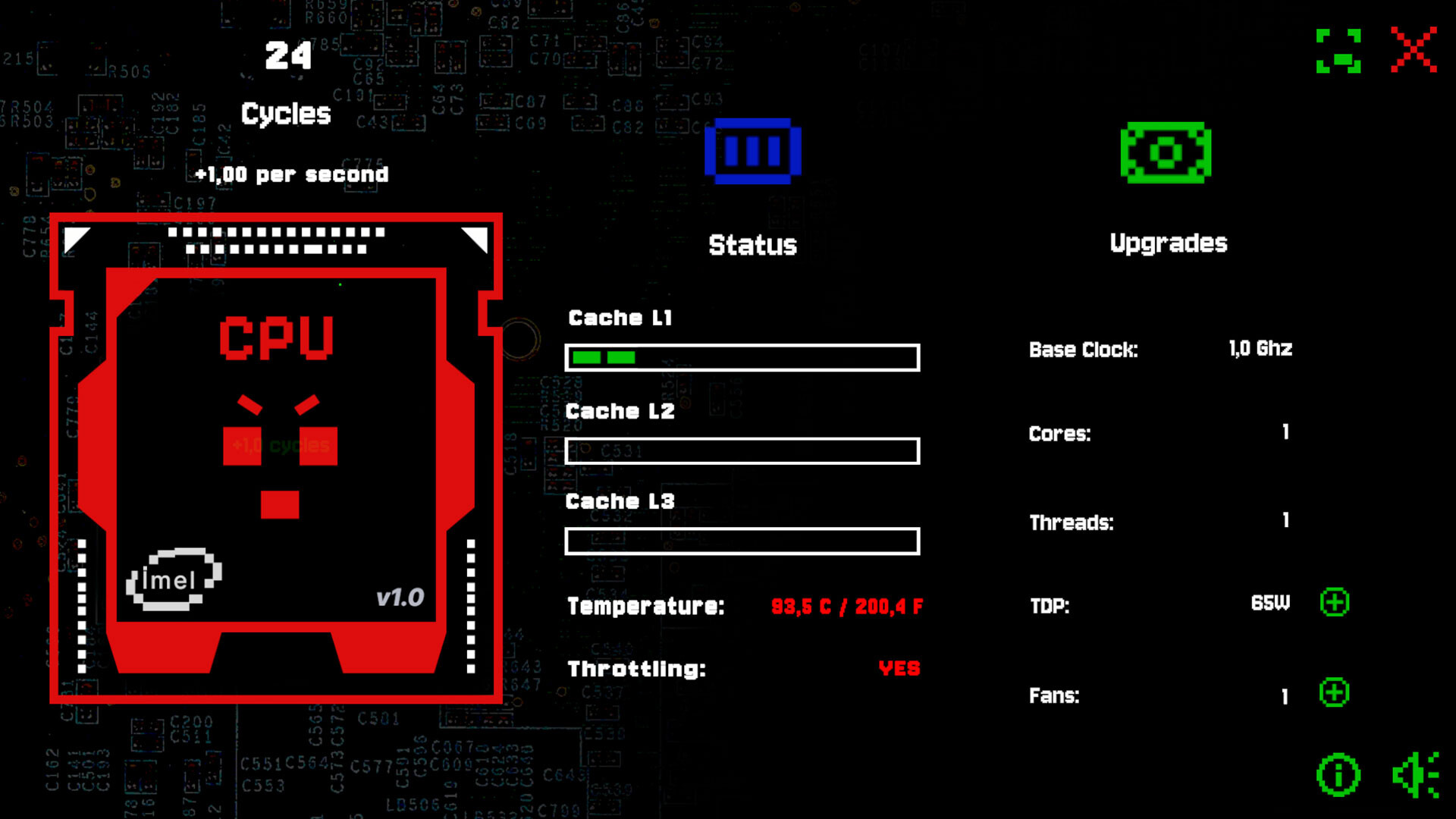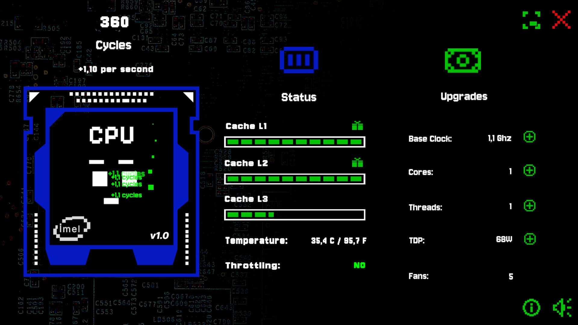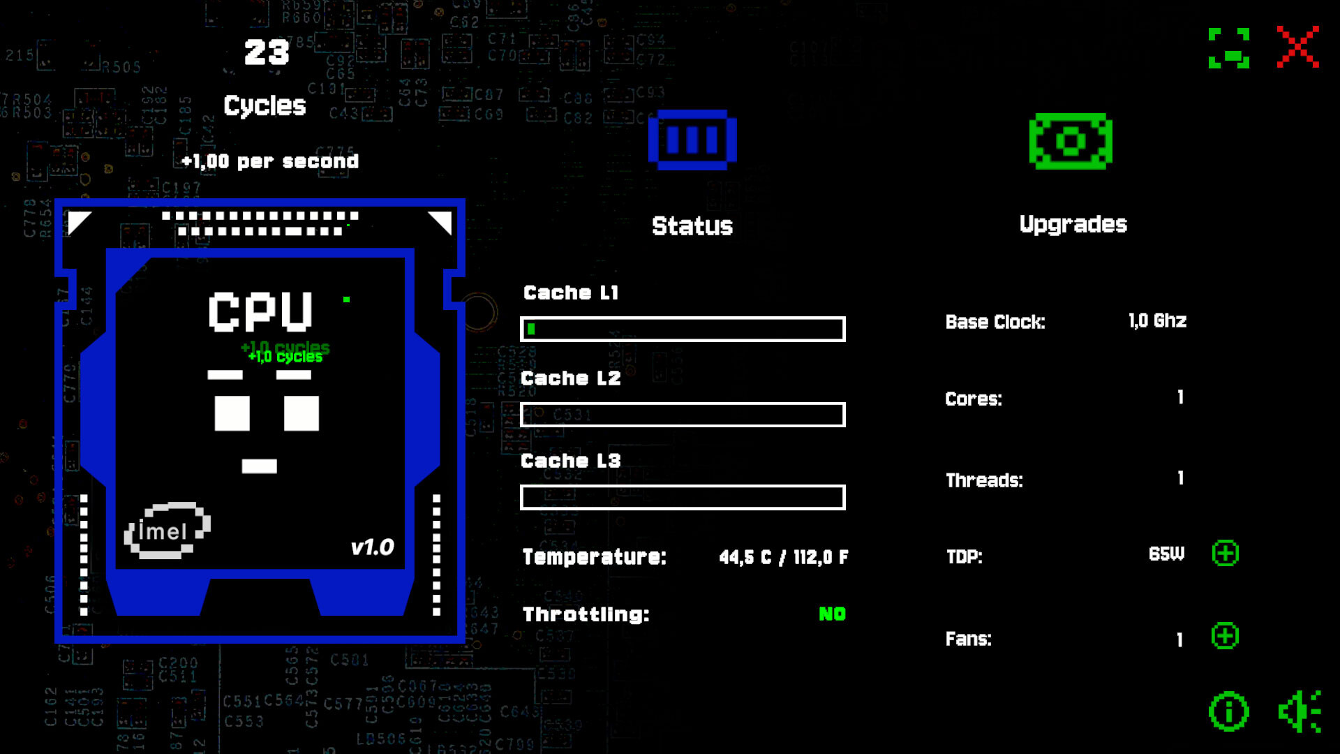 Click to generate cycles and power up your processor. Upgrade attributes to boost your production, push your CPU to its limits, and manage overheating before your system overloads and crashes.