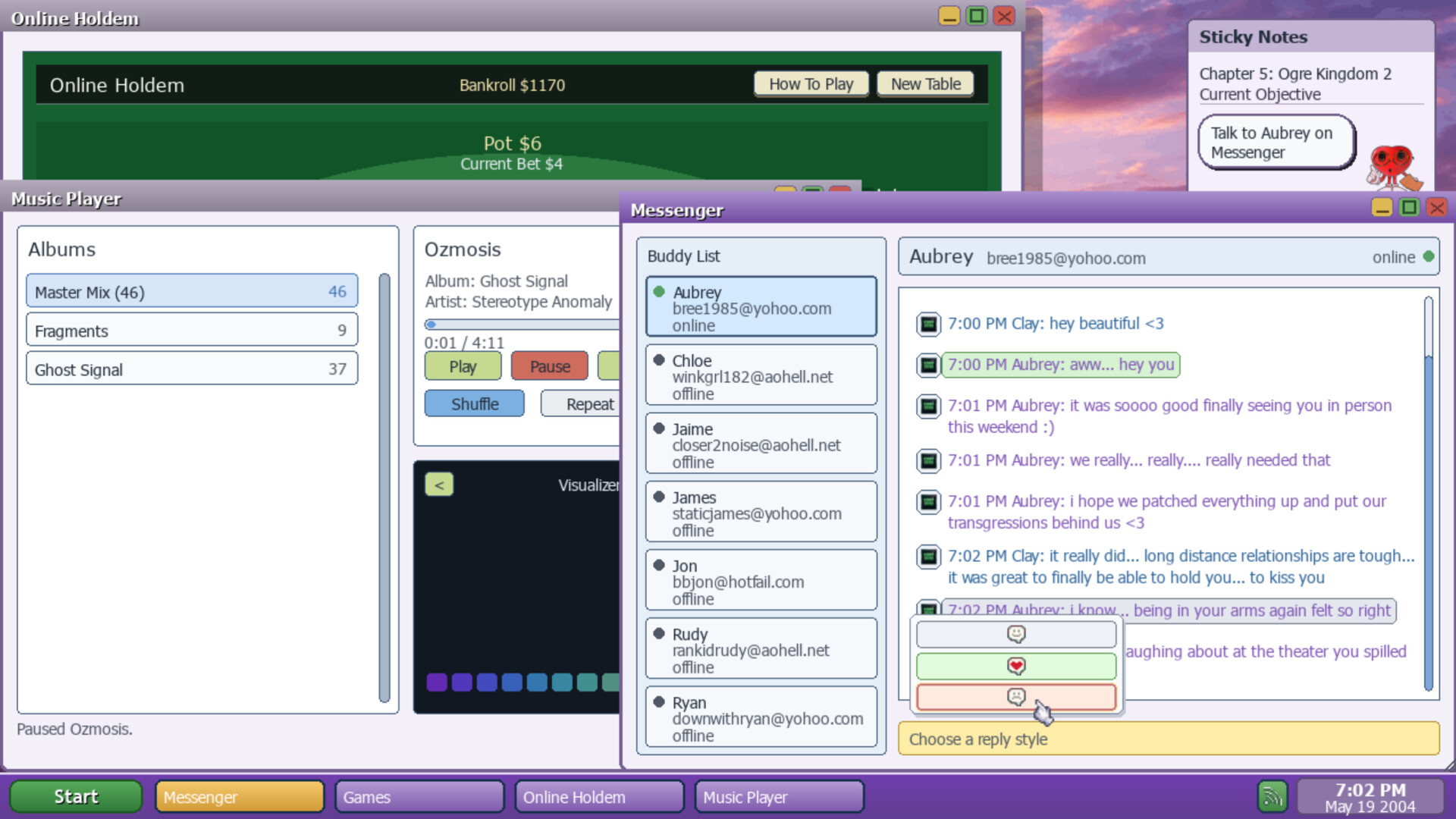 Step into a cluttered 2004 desktop packed with Messenger chats, IRC, email, music, weird websites, and late-night choices.