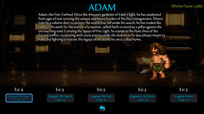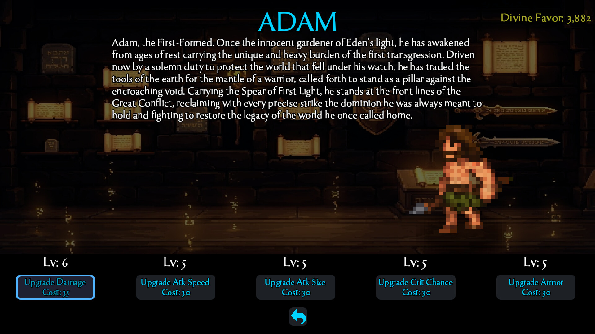 Spiritual Gifts: Spend your hard-earned Divine Favor between runs to purchase permanent upgrades to your Attack, Speed, Area of Effect, Critical Chance, and Armor.