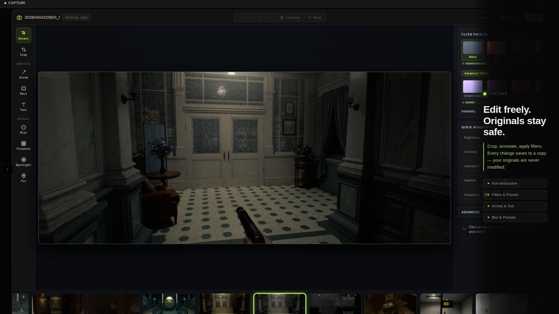 Встроенный редактор изображений — Редактируйте свои снимки с помощью инструментов и продвинутых цветовых фильтров. Сохраняйте варианты, никогда не теряя оригинальный файл.