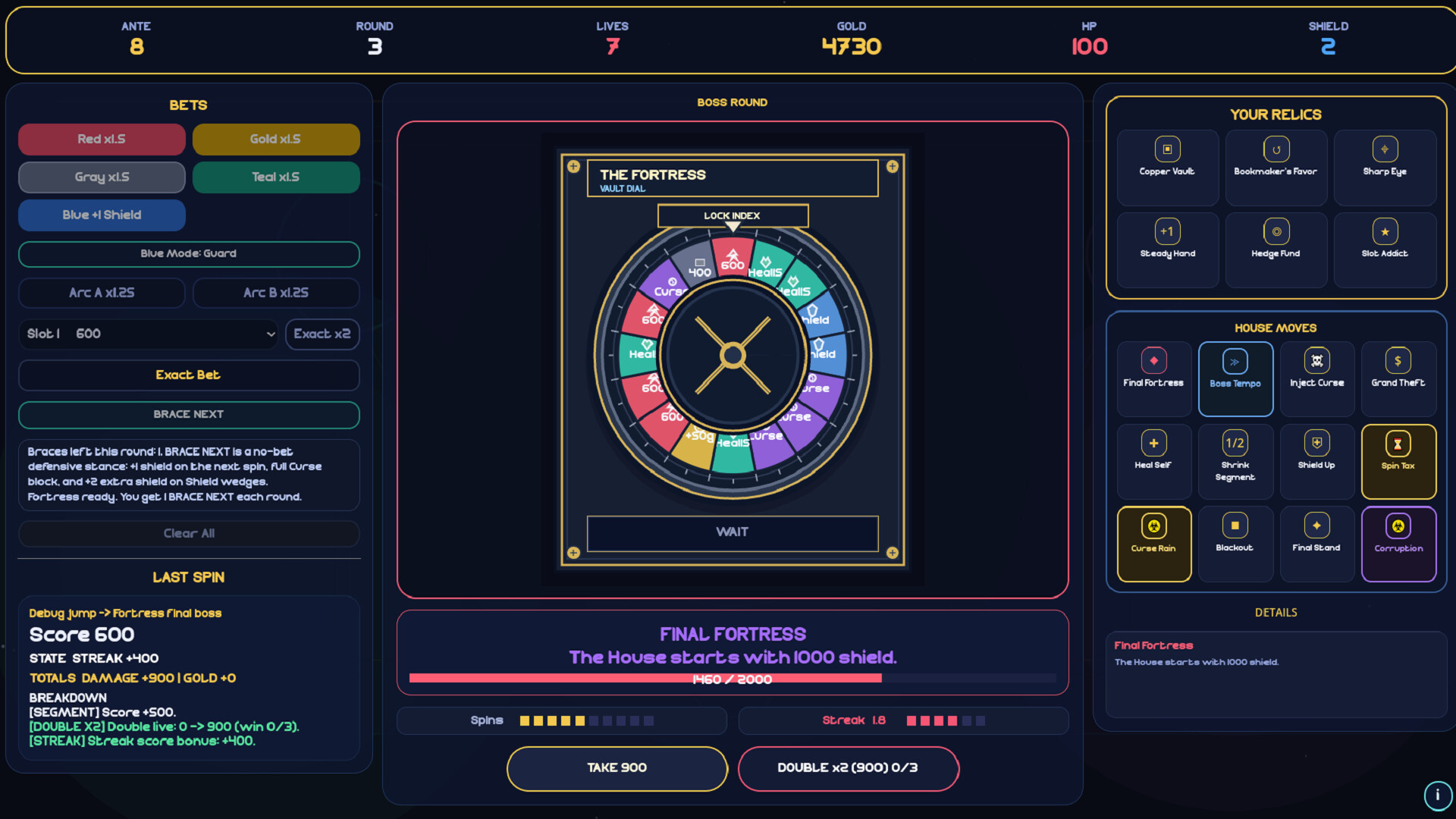 Build your spinning board, push your luck, and break the House in this high-risk strategy rogue-lite. Add and upgrade segments, manage bets and relics, survive brutal boss rounds, and decide when to cash out or go Double or Nothing.