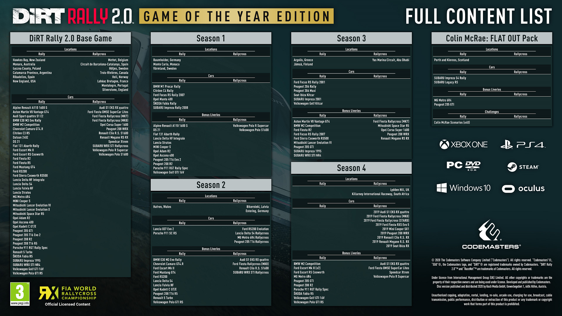 Сезоны 1, 2, 3, 4 для DiRT Rally 2.0, в которые вошло: